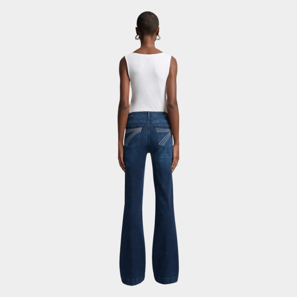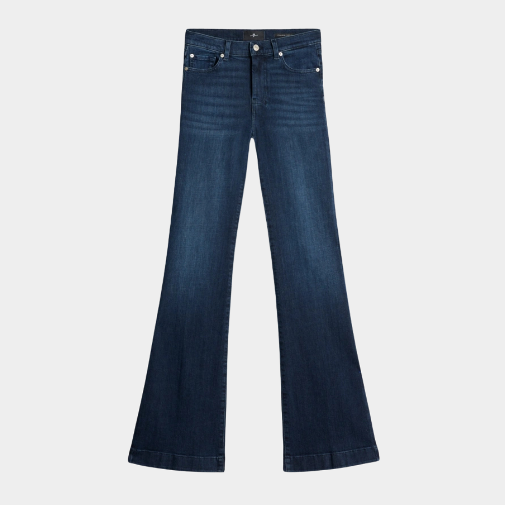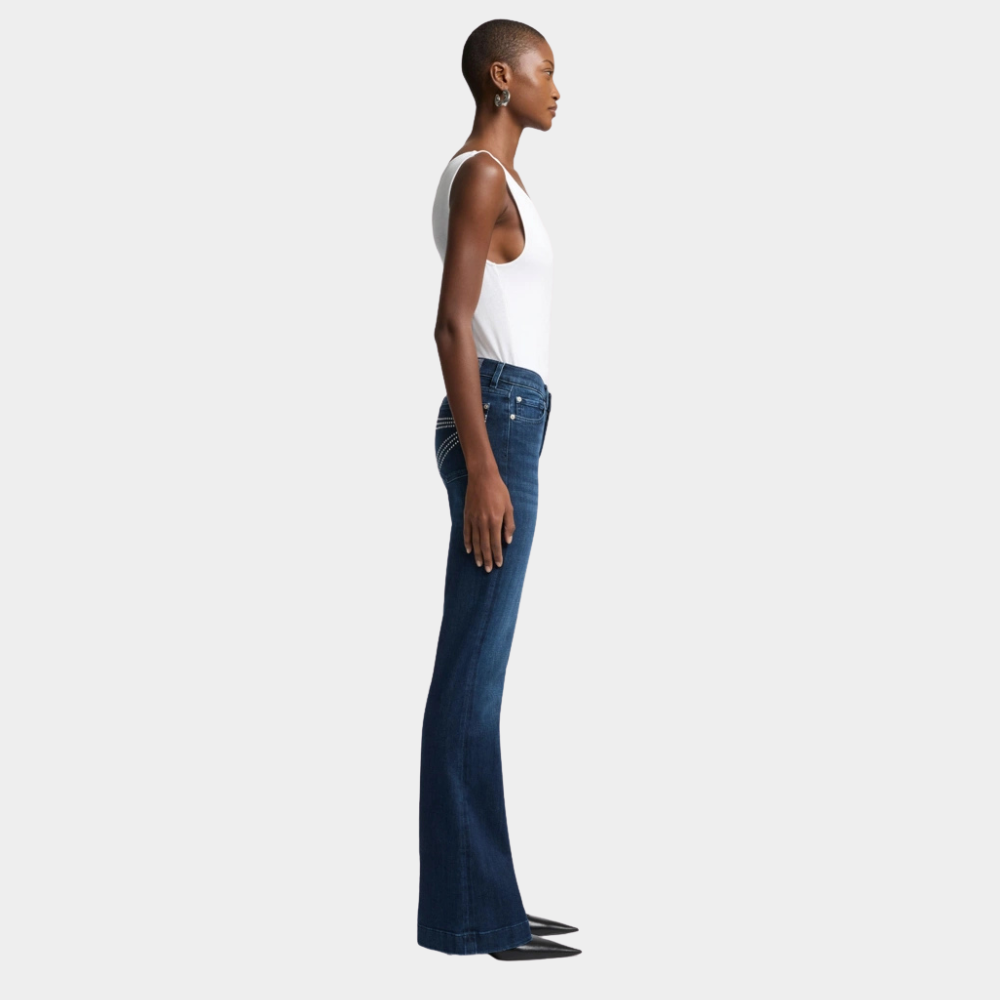 The Dojo jeans from 7 For All Mankind return with a fresh update, crafted in dark-blue Slim Illusion denim for a sleek, sculpted fit. This mid-rise silhouette hugs the hips and thighs before flaring out from the knee, creating a flattering, leg-lengthening shape. Studded embellishments add a touch of edge to the classic flare design. Made from premium-quality stretch fabric, these jeans offer both comfort and style. Pair them with a tank, crisp shirt, and pointed mules for an effortlessly elevated look.