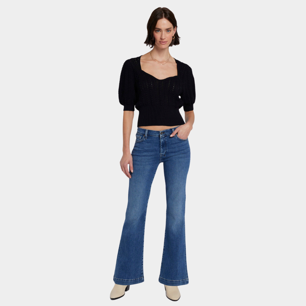 The Clara Dojo Loom Flare High-Rise Denim from 7 For All Mankind delivers modern cowgirl luxury with a flattering high-rise waist and flare leg silhouette. Finished in a medium loom wash with subtle distressing, whiskering, and fading, these jeans offer vintage character with timeless five-pocket styling and iconic “7” embroidery. Crafted from premium cotton with a touch of stretch, they balance classic denim feel with all-day comfort.